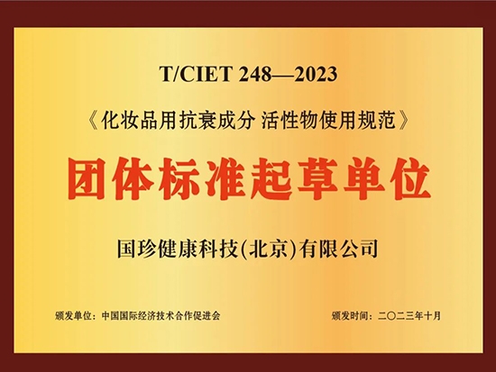 近日,健康產(chǎn)業(yè)公司國珍健康研究院攜手中國國際經(jīng)濟(jì)技術(shù)合作促進(jìn)會(huì),牽頭起草并發(fā)布了《化妝品用抗衰成分 活性物使用規(guī)范》團(tuán)體標(biāo)準(zhǔn)(T/CIET 248-2023)。健康產(chǎn)業(yè)公司作為該團(tuán)體標(biāo)準(zhǔn)主要起草單位,在團(tuán)體標(biāo)準(zhǔn)制定過程中做出了突出貢獻(xiàn),獲得了業(yè)內(nèi)高度評價(jià)。