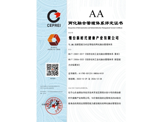 12月29日,煙臺生產(chǎn)基地——煙臺新時代健康產(chǎn)業(yè)有限公司(以下簡稱:煙臺健康公司)申報的兩化融合管理體系A(chǔ)A級評定正式獲批通過并取得相關(guān)證書。