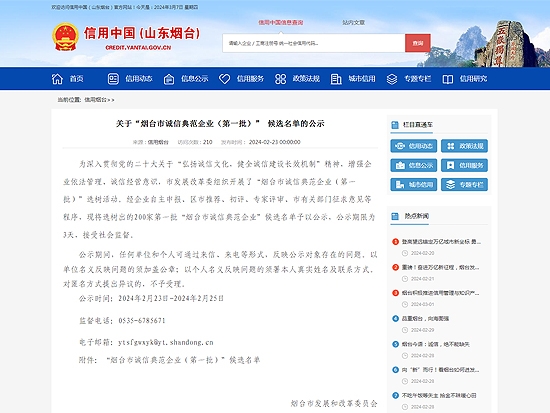 3月5日,煙臺市發(fā)展和改革委員會舉辦“親清發(fā)改會客廳”,邀請有代表性的企業(yè)參會,暢通企業(yè)問題反映渠道。會上發(fā)布了煙臺市2024年首批誠信典范企業(yè)名單,煙臺新時代健康產(chǎn)業(yè)有限公司被(以下簡稱:煙臺健康公司)選樹為第一批“煙臺市誠信典范企業(yè)”。